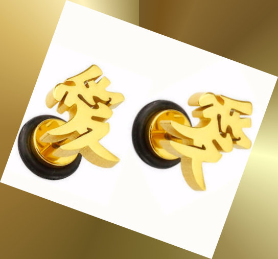 Pair (2 Pieces) Golden Love Logo Fake Cheater Ear Illusion Plugs - Shaft size: 16G , Lenght: 1/4". Logo is 12mm (1/2") with one rubber O-ring - Golden Plated on 316L Stainless Steel. -msin2382
