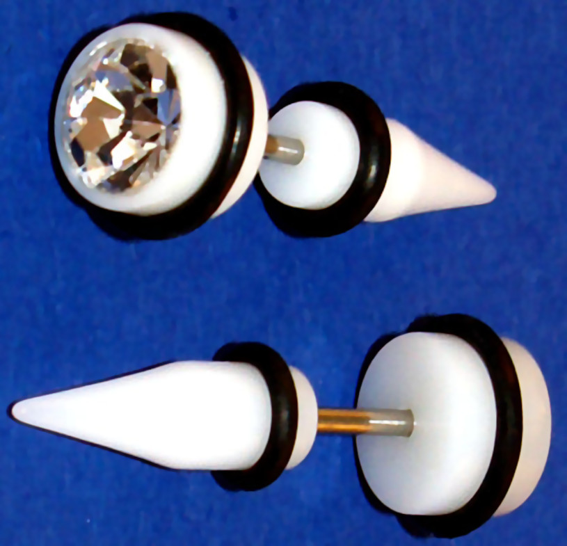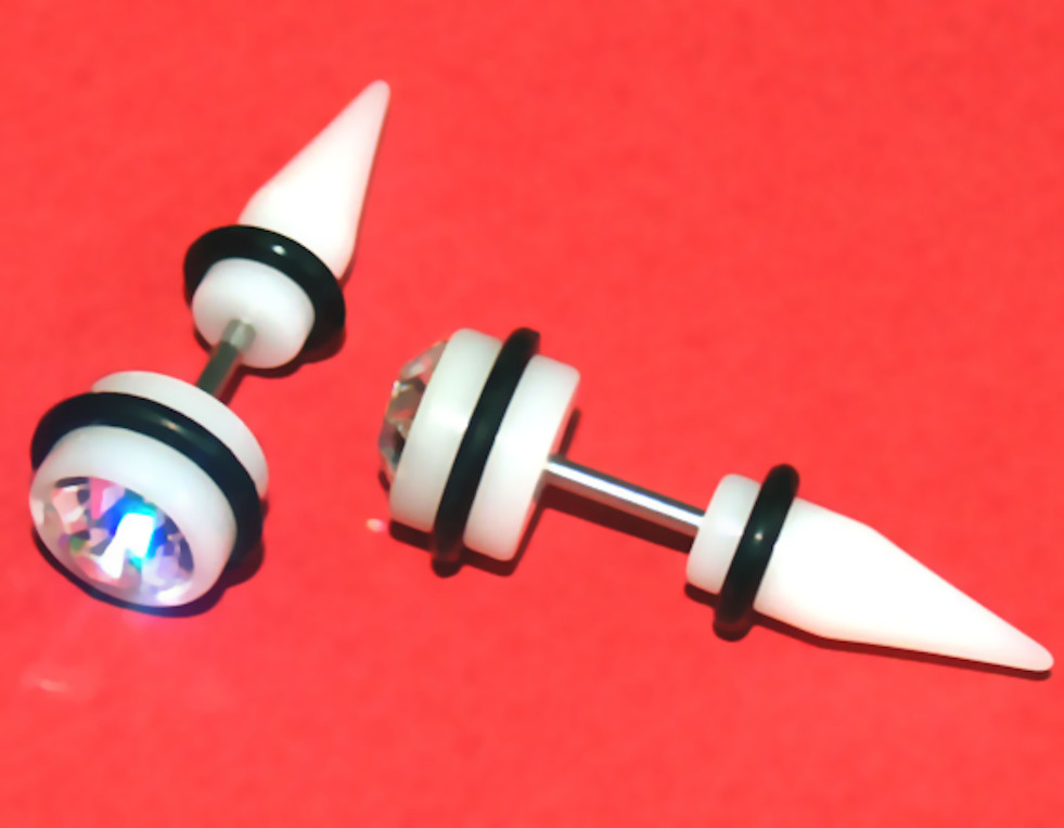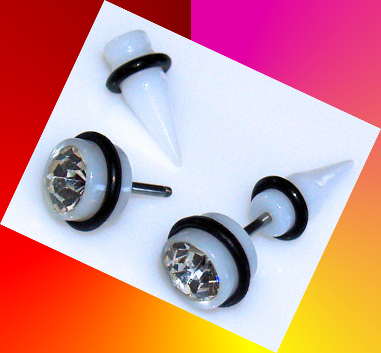 Pair (2 Pieces) Acrylic CZ White fake Taper Expander Cheater Ear Plugs - High quality acrylic disc and spike with two o-ring - Big Clear CZ size: 8mm - Get the 0 gauge look without stretching - Stainless Steel Shaft - Size: 16gauge - Length: 1/4" (6mm -Spike size: 15mm - msin486