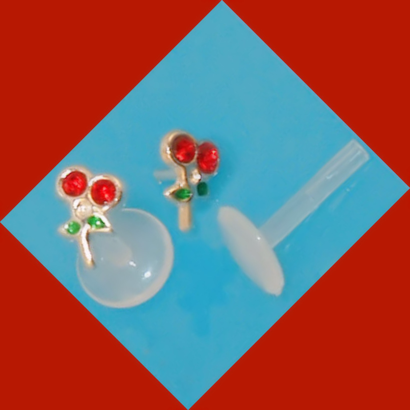 One Flexible Acrylic Cherry Top Lip Labret Ring Jewelry Piercing Stud with red Cherry Top- Flexible, easy to wear- Push-in pin. No need to twist - Size: 16 gauge (1.2 mm)- Length: 5/16" (8mm) or cut to your preferred length -msin2350