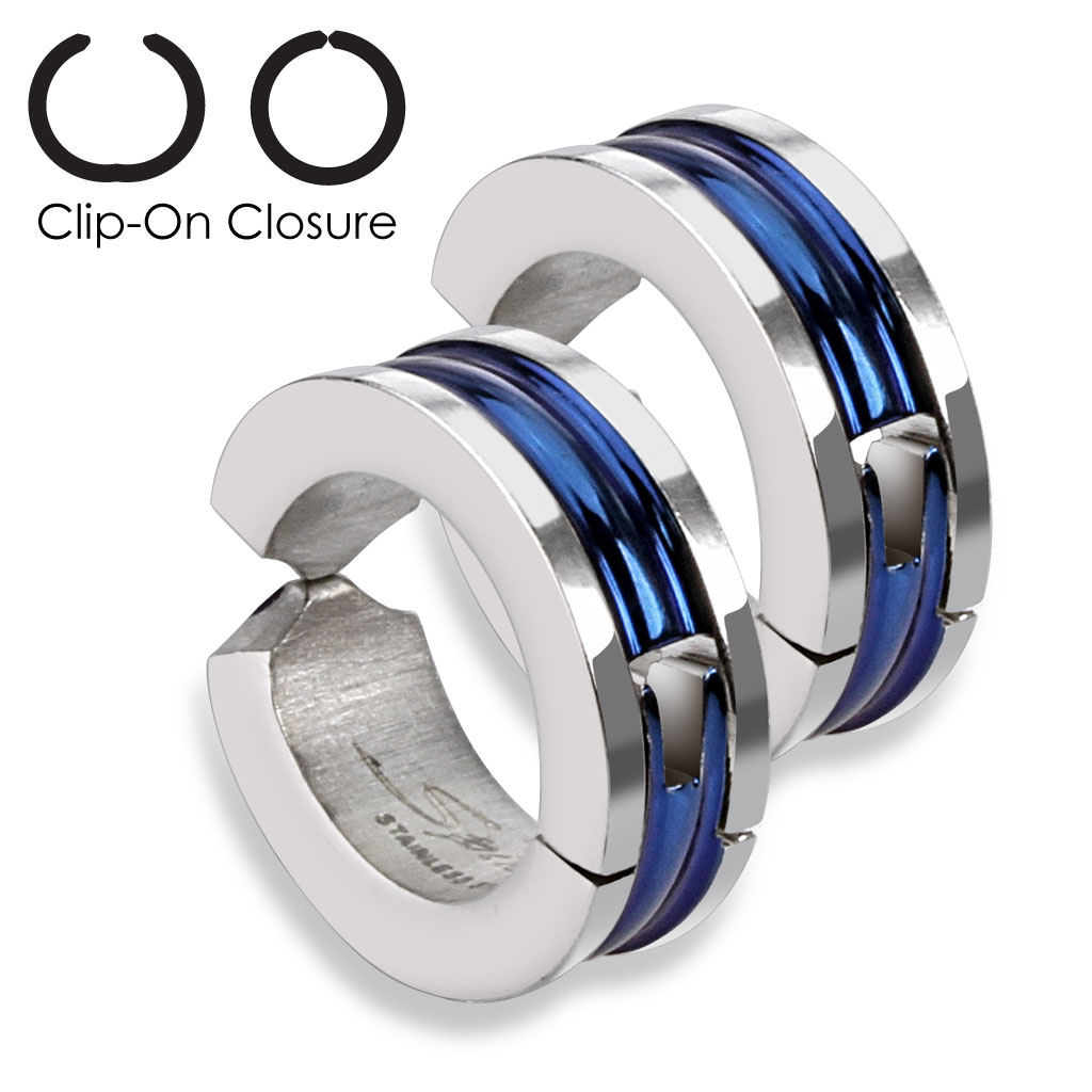 Pair (2 Pieces) Inlay Blue IP Non Piercing Earring Hoops Clip On Cuff Ear Jewelry- Anodized Stainless Steel - Color: Blue and Silver - Thickness: 0.18 (4.5mm) - Diameter: 9mm -Length: 0.51 (13mm), Width: 0.51 (13mm) -,msin2517