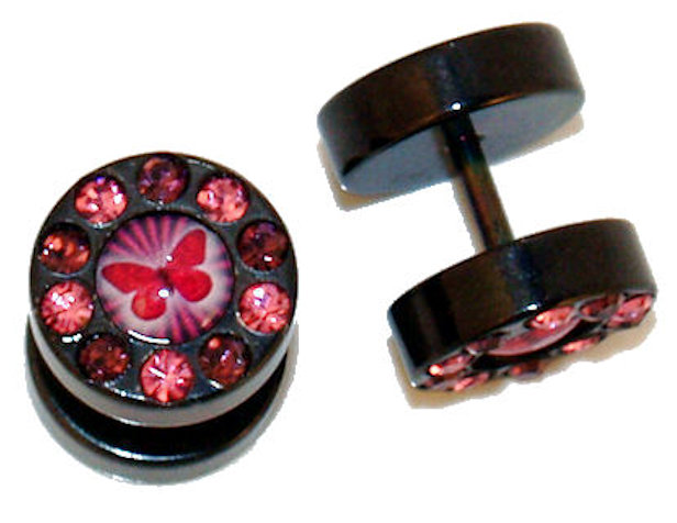 Pair Steel Black Ear Cheater With Butterfly Print And CZ Fake Plugs 16 Gauge