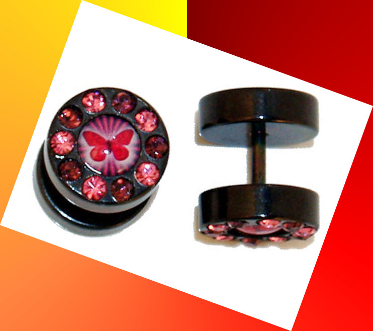 Pair (2 Pieces) Steel Black Ear Cheater With Butterfly and CZ Print Fake Plugs 16 Gauge- Print on one side - Made of anodizing Steel - No Ear Stretching needed. look like real 00G- 00 Gauge Acrylic ends - 316L Steel Shaft - Shaft Size: 16 gauge - Length: 1/4" (6mm).-msin2334
