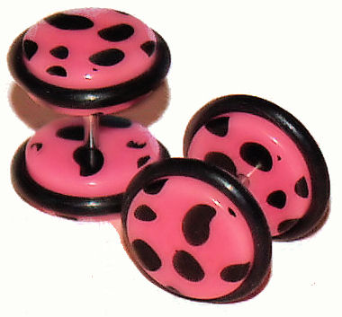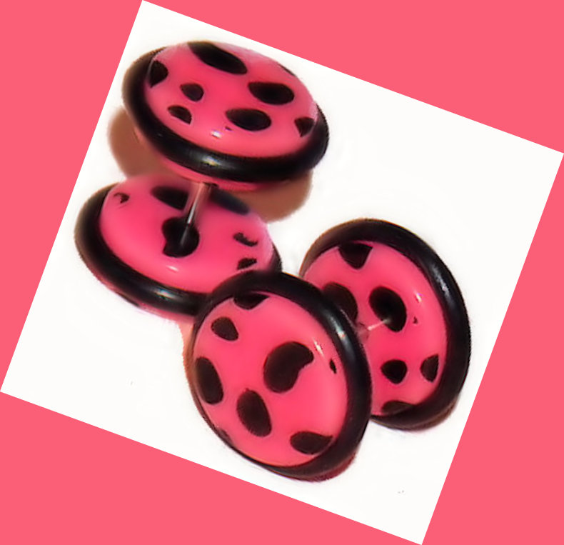 Pair (2 Pcs) Acrylic Pink with Black Dots Fake Cheater Plugs 00g- High quality Acrylic - Two O Rings- 316L Stainless Steel Shaft - Size: 16 gauge - Length: 1/4" (6mm) - msin2106