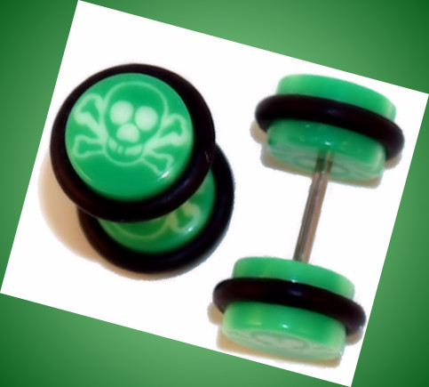 Pair (2 Pieces) Green Acrylic Skull Ear Cheater Illusion Fake Plugs 0G - 16 Gauge shaft. 0 Gauge Acrylic ends with rubber O-Rings - 316L Stainless Steel Shaft - Size: 16 gauge - Length: 1/4" (6mm) - Get the 0 gauge look without stretching - msin818