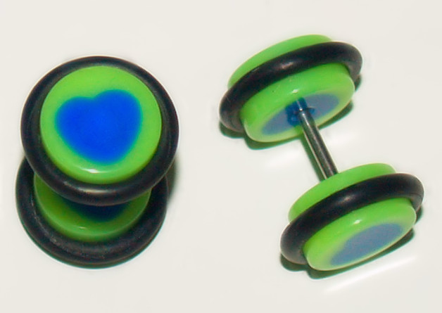 Pair (2 Pieces) Green Acrylic Ear Cheater With Blue Heart Fake Illusion Plugs 0G - 16 Gauge shaft. 0 Gauge Acrylic ends with rubber O-Rings - 316L Stainless Steel Shaft - Size: 16 gauge - Length: 1/4" (6mm) - Get the heavy gauge look without stretching - msin814
